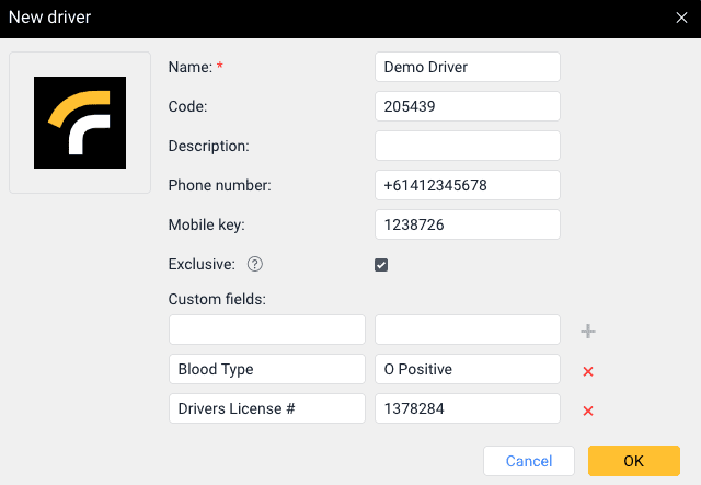 Enter the desired details as required, you can also create as many custom fields as you deem necessary, you can also add a photo of the driver. Once finished lcick the ‘OK’ button, the driver is then shown on your driver’s list: