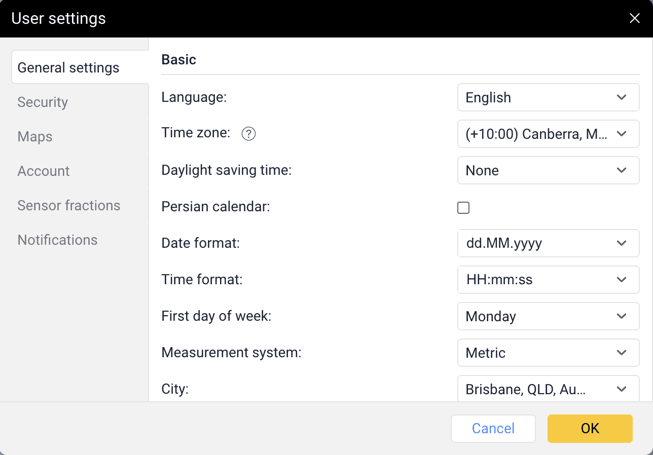 Select one of the available measurement systems. This setting is taken into account when creating routes, using tools, and calculating distances from units to geofences and cities. When you select a new measurement system, it doesn’t change for the previously created units and resources with their content. For reports, you can select the measurement system in their settings.